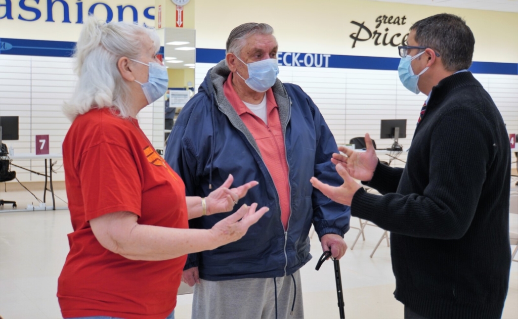 Mary and Chuck Rich, who received their first COVID-19 vaccination shots at the official opening of the York County mass vaccination clinic in Sanford on Tuesday, chat with Maine CDC Director Dr. Nirav Shah. Tammy Wells Photo