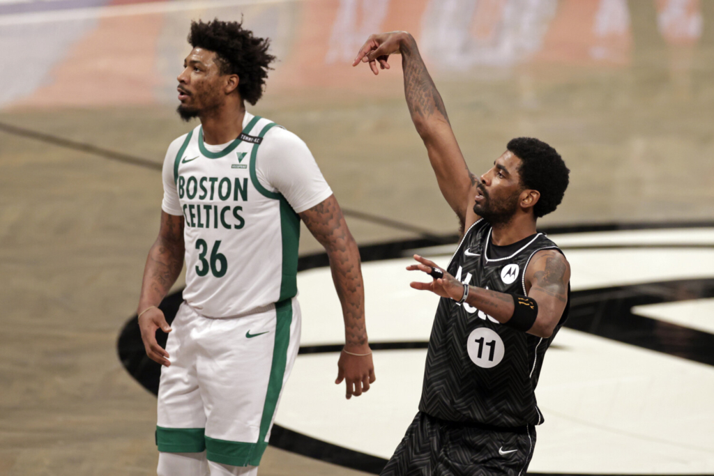 Brooklyn’s Kyrie Irving watches his shot next to Boston’s Marcus Smart in the second half Thursday at Brooklyn. Adam Hunger/Associated Press