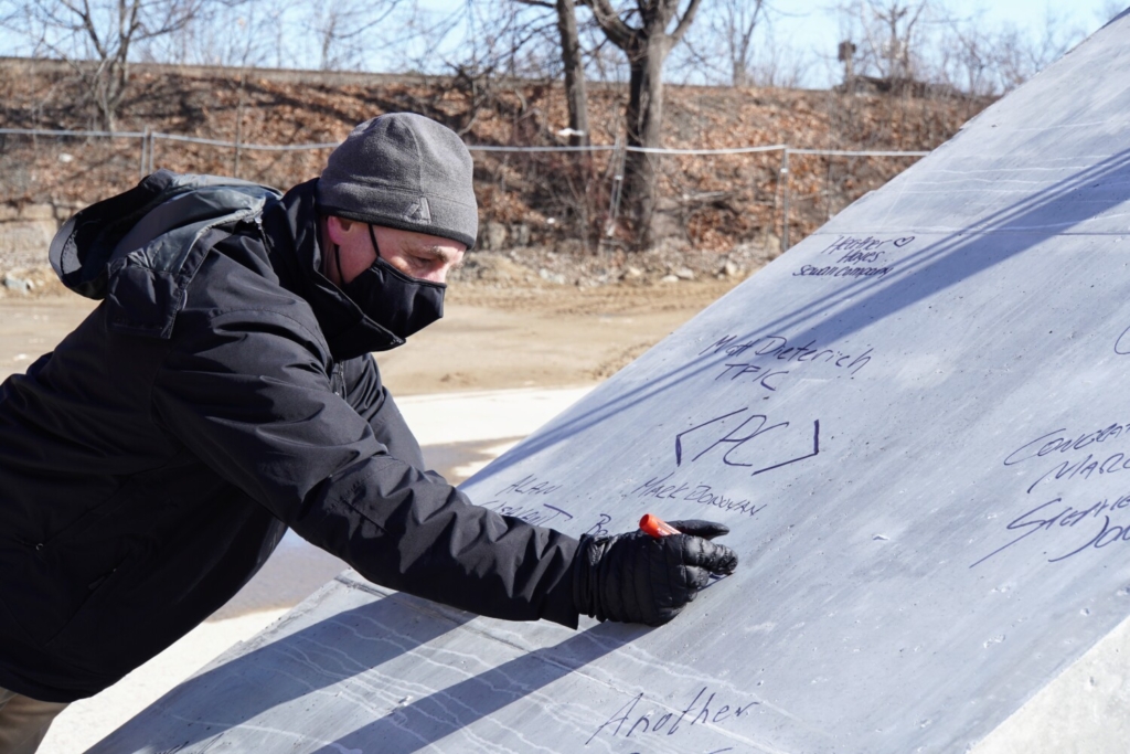 Biddeford Chief Operating Officer Brian Phinney signs a concrete slab that was later lifted by crane to the top of Biddeford’s new parking garage Friday morning as part of a ‘Topping Off’ ceremony, which signals significant progress on a construction project. Tammy Wells Photo