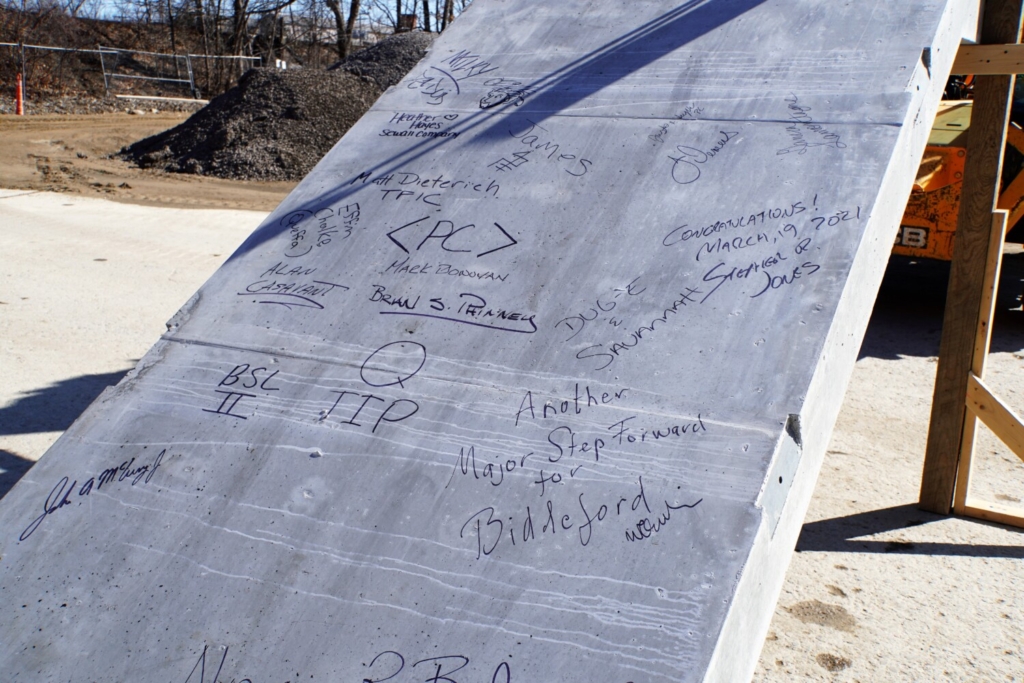 “It’s a real symbolic day for the city of Biddeford,” said Mayor Alan Casavant as he watched city staff and others sign the slab before the brief ceremony began. “So many said this would never happen here. This demonstrates the city is committed to changing the paradigm of Biddeford from an old mill town to a thriving community.”