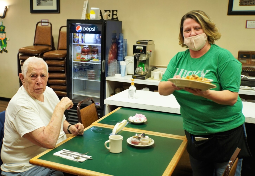 Missy Raymond, right, serves breakfast to Louis Hebert at Jonesy’s Main Street Cafe on St. Patrick’s Day morning. The popular venue will close on March 28. Tammy Wells photo