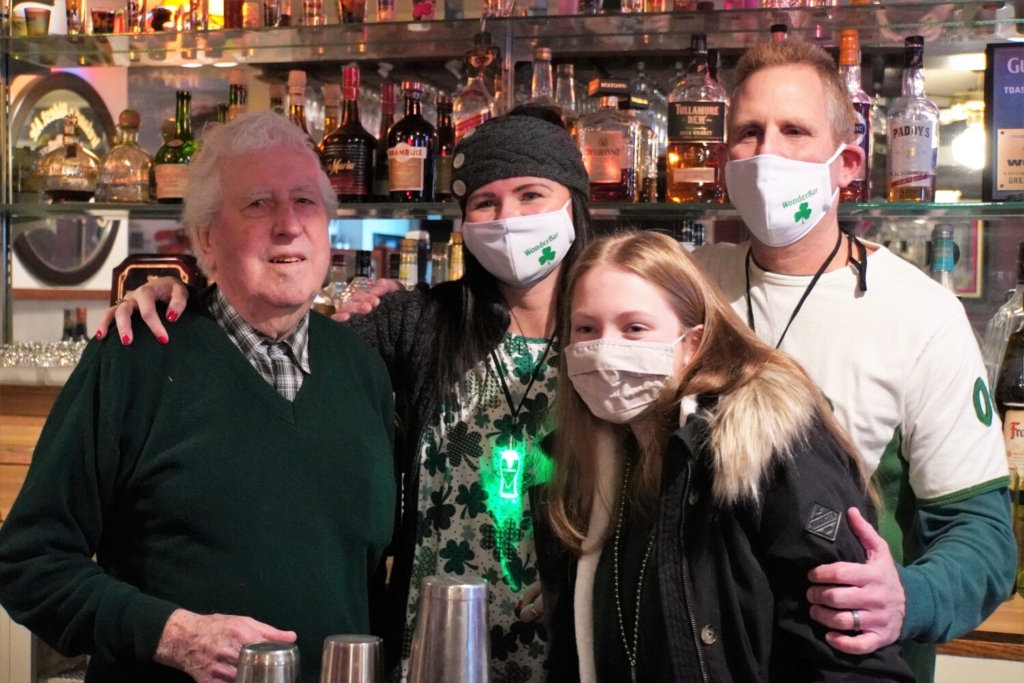 Vince Keely, left, pauses for a St. Patrick’s Day photo at the WonderBar restaurant with daughter-in-law Molly, son Brian and granddaughter Brianna. Keely has made the decision to sell the Washington street landmark. Tammy Wells photo
