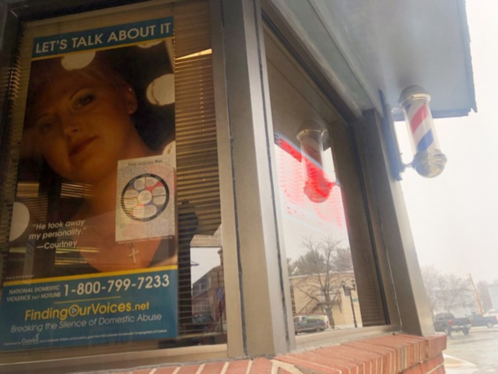 A banner featuring Courtney, a Rockland hairdresser, is in the window of a Biddeford barber shop. Similar banners will be posted around other areas of York County this weekend. Courtesy photo