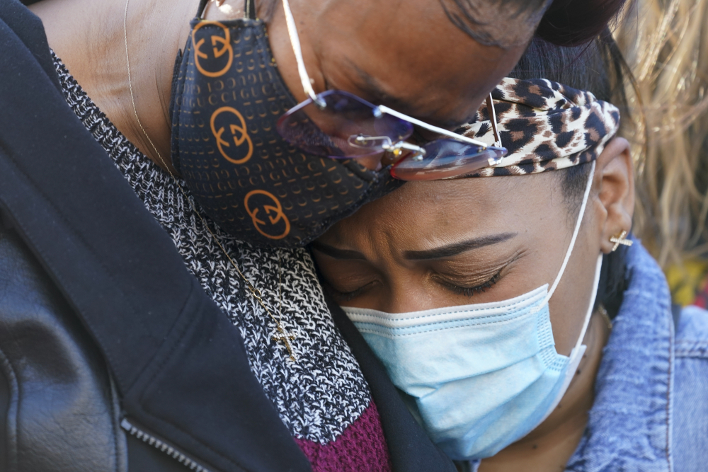 DMX’S ex-wife Tashera Simmons, left, and his fiancé, Desiree Lindstrom, embrace during a prayer vigil outside of White Plains Hospital on Monday. Supporters and family of the rapper DMX chanted his name and offered up prayers outside the hospital where he was on life support. Associated Press/Mary Altaffer