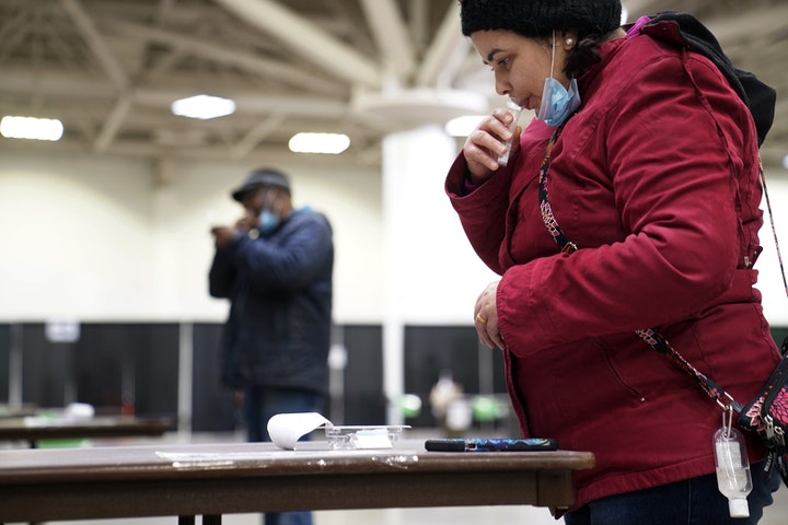 Minnesota health officials offered private tours to community organizations of free COVID-19 testing sites as well as a chance to get tested. Here, Gettanjali Mittal, right, of Sewa-Aifw, a nonprofit that supports wellness among South Asian families, receives a COVID-19 test while touring the testing facility at the Minneapolis Convention Center in January. David Joles/Star Tribune, File via TNS