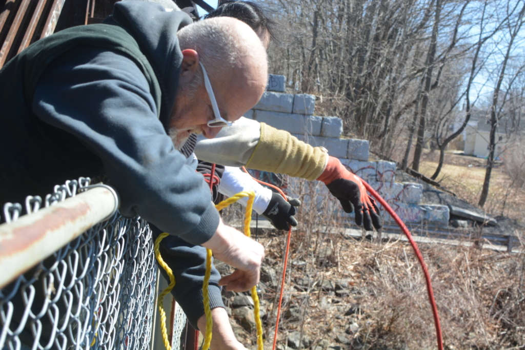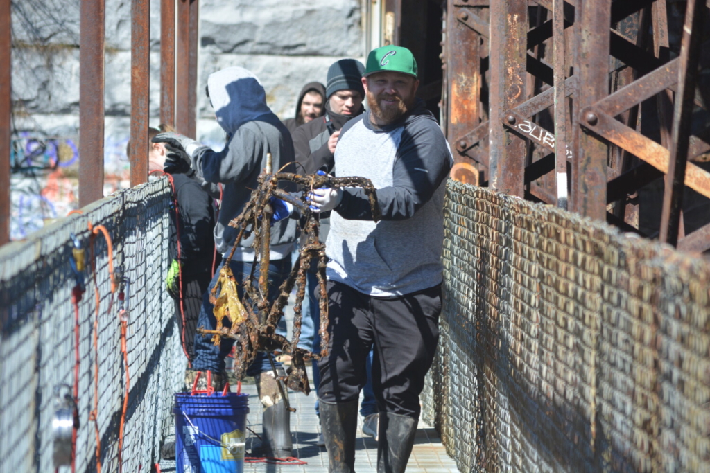 “We’ve got Wessie,” joked Busch, yelling down the line of fishers, who he met through a Facebook group. “We are cleaning up the river one piece of junk at a time!”