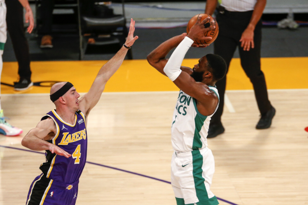Boston’s Jaylen Brown shoots over the Lakers’ Alex Caruso Thursday night in Los Angeles. Brown scored 40 points, two shy of his career high. AP Photo/Ringo H.W. Chiu