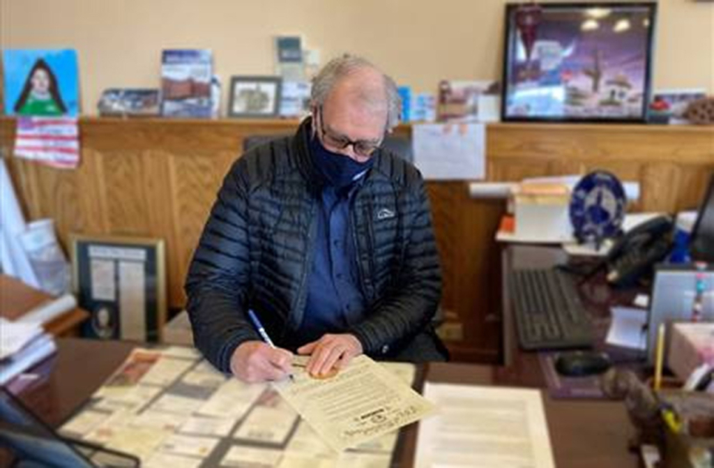 Bidddeford Mayor Alan Casavant signs a proclamation declaring April 10-16, 2021 Week of the Young Child in Biddeford. The city’s 2nd year of a lead poisoning prevention program was highlighted that week. Courtesy photo