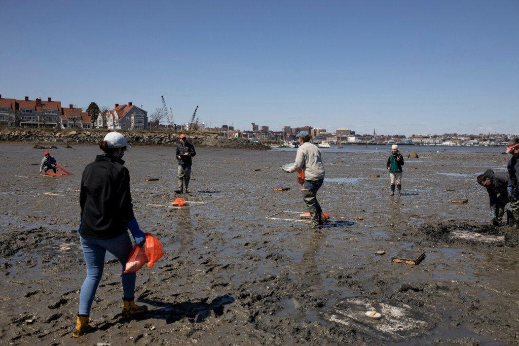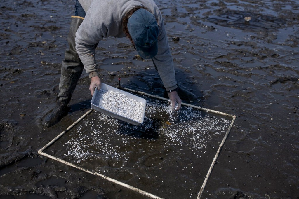 On Friday afternoon, as the tide receded, Holmberg and his colleagues ventured onto the flat, their boots sinking into the shiny, gray mud. Working quickly, they distributed the crushed shells according to size and in varying amounts among 120 plots, each measuring one square yard. Half the plots were covered with netting to keep green crabs from devouring clams that might grow in the mud.