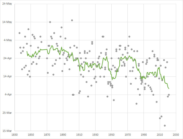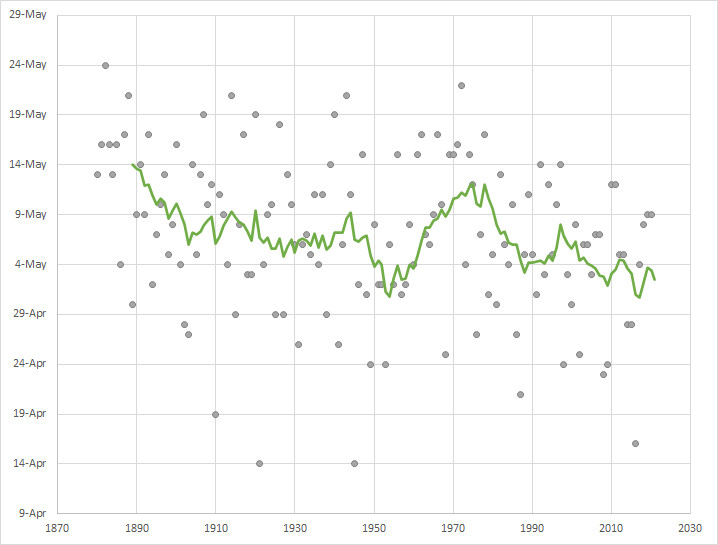 Ice-out dates for Rangeley Lake dating back to 1880. Ice-out occurs on average 11 days earlier now at Rangeley Lake than it did in the late 1800s. The green line represents the rolling 10-year average, which smooths out yearly swings in ice-out dates and provides a clearer picture of long-term trends.