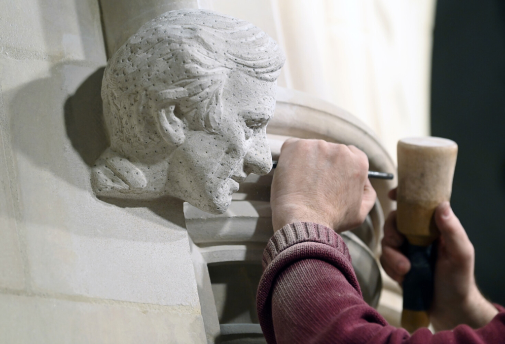 Stonemason Sean Callahan works on a sculpture of Elie Wiesel in the Washington National Cathedral on March 18. Washington Post photo by Matt McClain