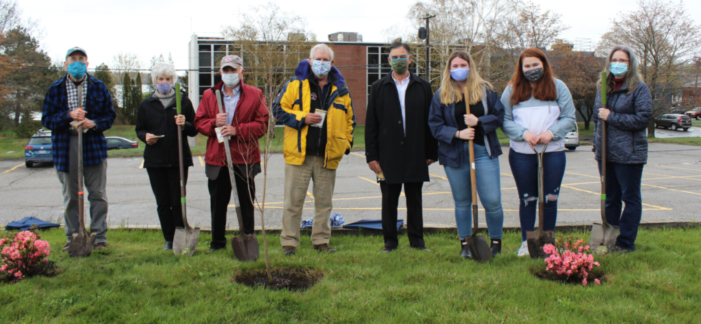 Southern Maine Community College held a spring planting ceremony to celebrate its 75th anniversary this year. Shown at the South Portland Campus are, from left, Professor Brian Tarbox, foundation donor Eleanor Redmond, foundation board member and donor John Boyne, former longtime professor David Pratt, Maine Community College System President David Daigler, students Sarah Metcalf and Natalie Potter, and SMCC Professor Norma Willis. Contributed / SMCC