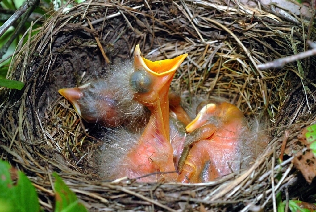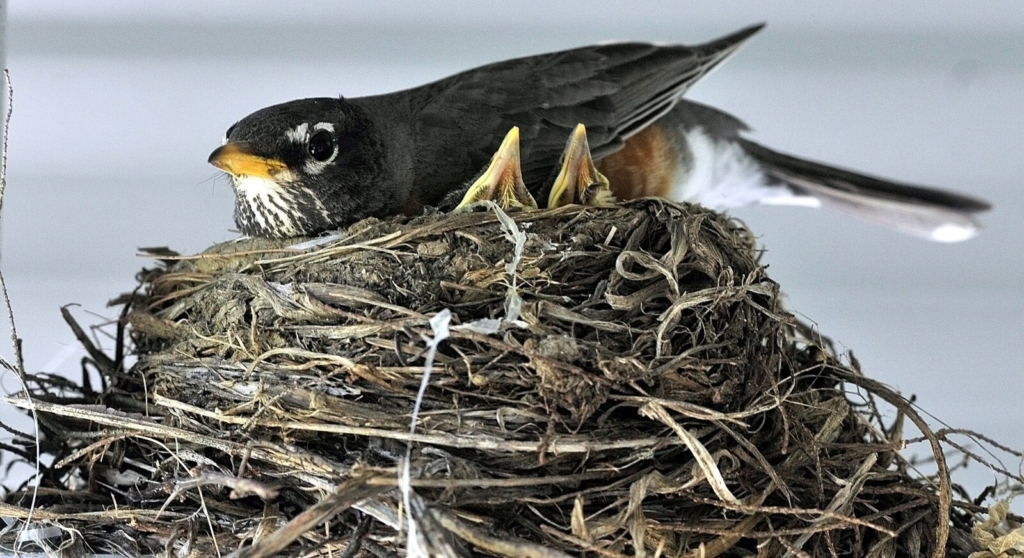 Three newborn robin chicks huddle together as one reacts to noise by opening its beak in hopes the mother bird would drop some food. Staff file photo