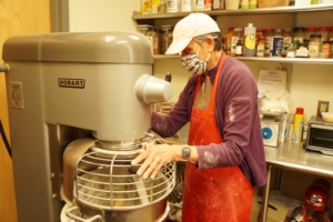 Carol Xanthopoulos mixes dough for kourambiethes, a buttery shortbread cookie at St. Demetrios Church in Saco on a recent day. The cookies are among an array of tasty delights on offer at the Greek Fest Express pick-up on July 10. Folks can order through the St. Demetrios Church website June 15-30. Tammy Wells Photo
