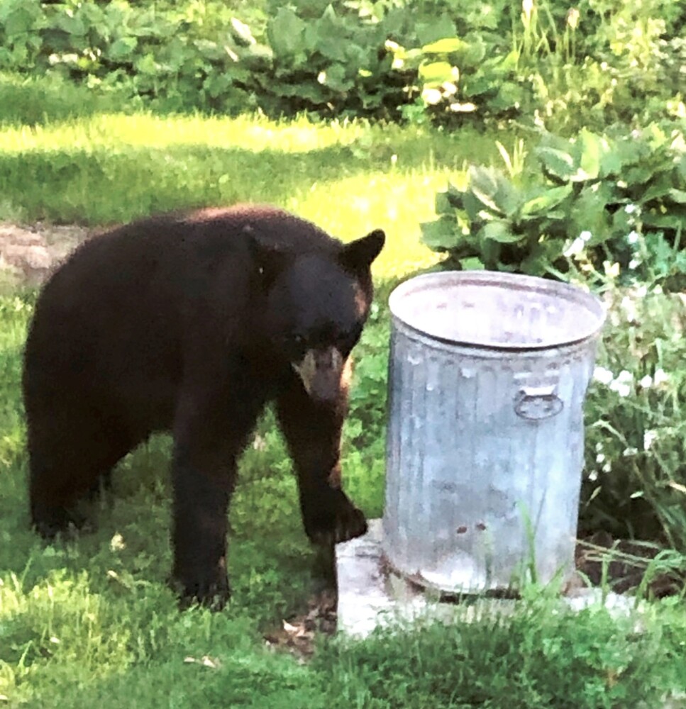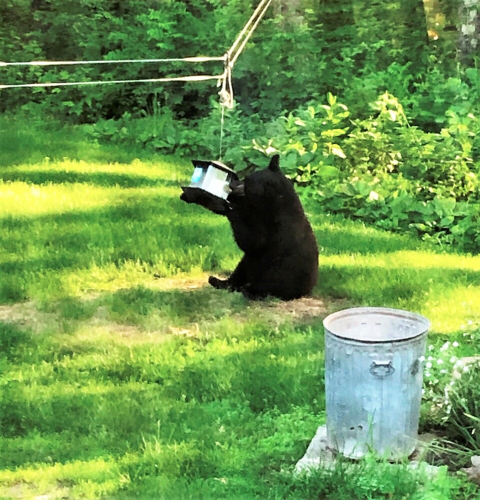 The bear reached up to a birdfeeder attached to the clothesline to grab some seed for breakfast, wandered over to a galvanized trash can – and was presumably disappointed to find it had held only wood ashes and not some enticing, stinky trash.