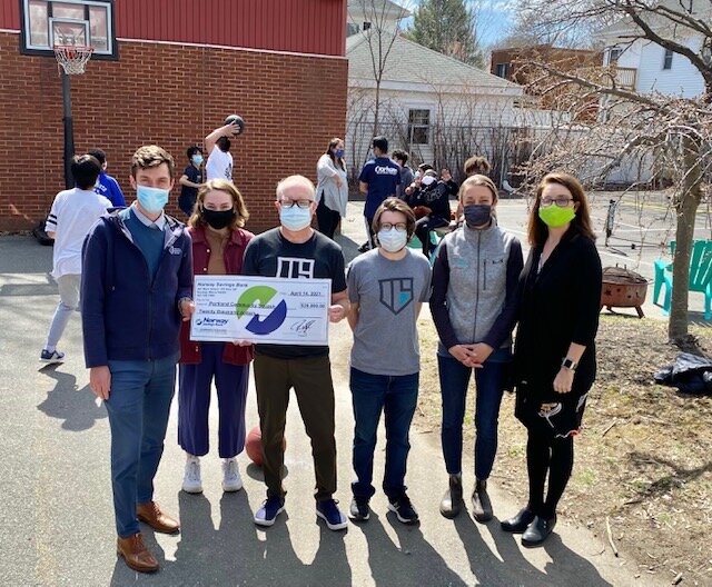 Portland Community Squash staff members Barrett Takesian, Maggie Holdorf, Paul French, Curtis Simoneau and Sarah Stickney accept a $30,000 donation from Melissa Rock, marketing and communications officer VP at Norway Savings Bank, which is a gold sponsor of the nonprofit. Contributed / Norway Savings Bank