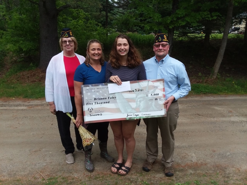 Brianna Foley, a 2021 graduate of Freeport High School, is the winner of the J. Arthur Stowell Scholarship Award in the amount of $5,000 from American Legion Post 83 in Freeport. Foley plans to eventually become a neurosurgeon. From left are, Joyce Clarkson-Veilleux; her mother, Catherine Foley; Foley; and Jim Dryer. Contributed / Jay Finegan