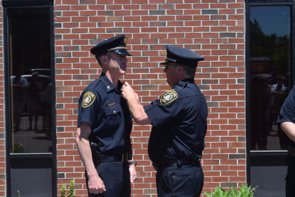 Former Bath Police Chief Mike Field put the badge identifying Andrew Booth as the city’s new chief on Thursday, June 24. Booth will start his first day as chief the following day. Kathleen O’Brien / The Times Record