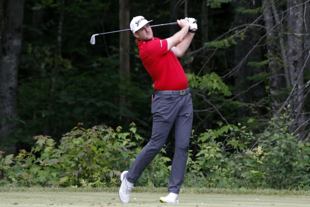 Taylor Pendrith of Richmond Hill, Ontario, watches his shot on the fourth hole during the second round of the Live and Work in Maine Open on Friday at Falmouth Country Club. Ben McCanna/Portland Press Herald Buy this Photo