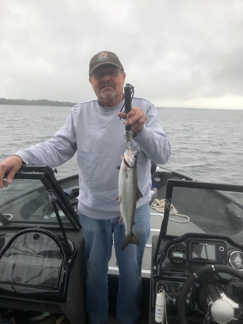 To wrap up the past week, I guided a father and son from their home on Sebago Lake. We just got all four lines in the water when a salmon rig went off, right as we trolled in front of their place. Live shiners did the trick this time and dad reeled in a gorgeous, fat salmon. He texted his wife that they were indeed having salmon for the Fourth of July and she was elated. Another salmon that he gifted to an appreciative neighbor and a few lakers rounded out the morning for this happy crew.