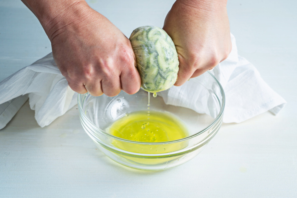 Working in batches if necessary, place the grated zucchini in the center of a clean dish towel. Twist the edges of the towel so you have a packet that looks like a wrapped peppermint candy, and squeeze as much liquid as you can out of the zucchini. Don’t be afraid to be aggressive, pressing and twisting multiple times, rotating the bundle as you work. By the end, you should have extracted about 1/4 cup liquid, though the exact amount may vary. (Sip the liquid as is, or mix with a little sparkling water for a refreshing riff on cucumber water.)