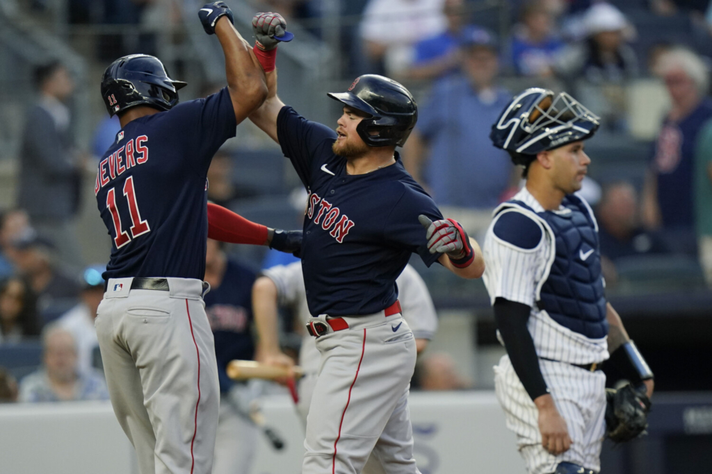 Christian Arroyo, center, celebrates with teammate Rafael Devers, left, as New York Yankees catcher Gary Sanchez, right, looks away after Arroyo hit a two-run home run in the second inning of Boston’s 4-0 win on Friday in New York. Frank Franklin II/Associated Press