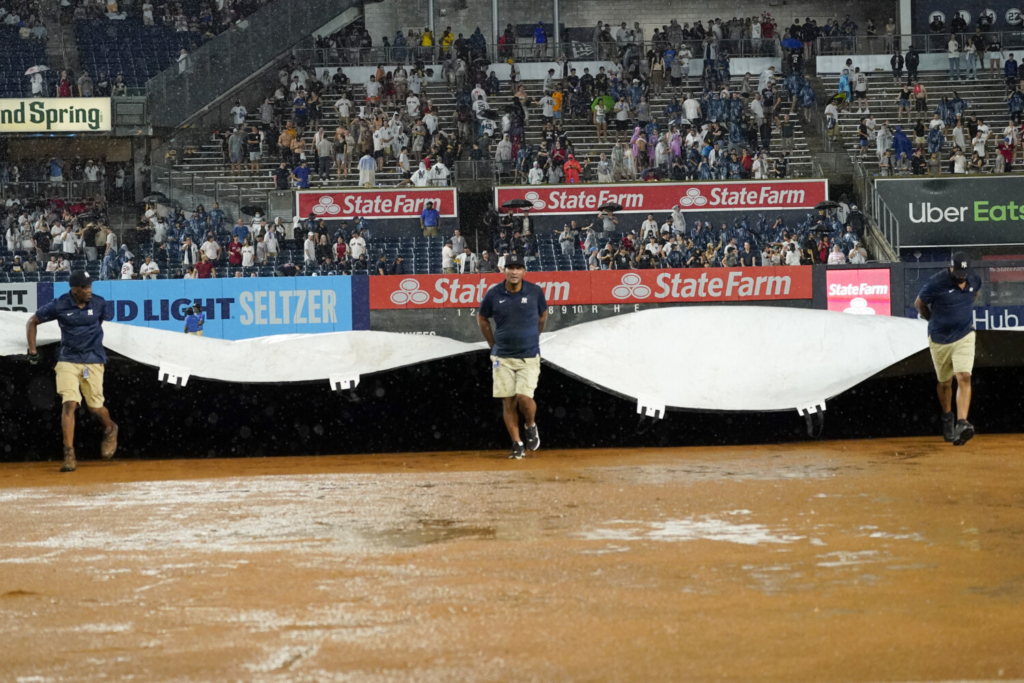 The Yankee Stadium grounds crew rolls out the tarp after the sixth inning of Saturday’s game between the Yankees and Red Sox. The game never resumed, and New York won, 3-1. Mary Altaffer/Associated Press