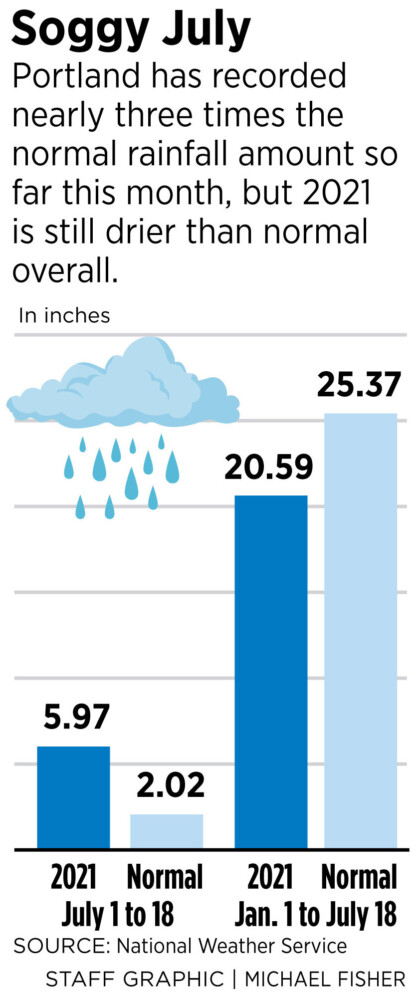 Portland recorded 5.97 inches of rain during the first 18 days of July, nearly 4 inches more than normal. While it has been unusually cool and wet at a peak time for summer vacations and outdoor activities, the rainfall is making a dent in the drought.