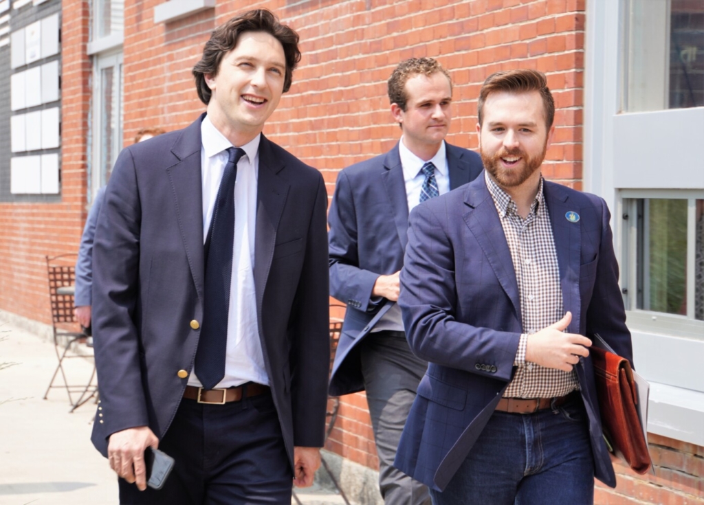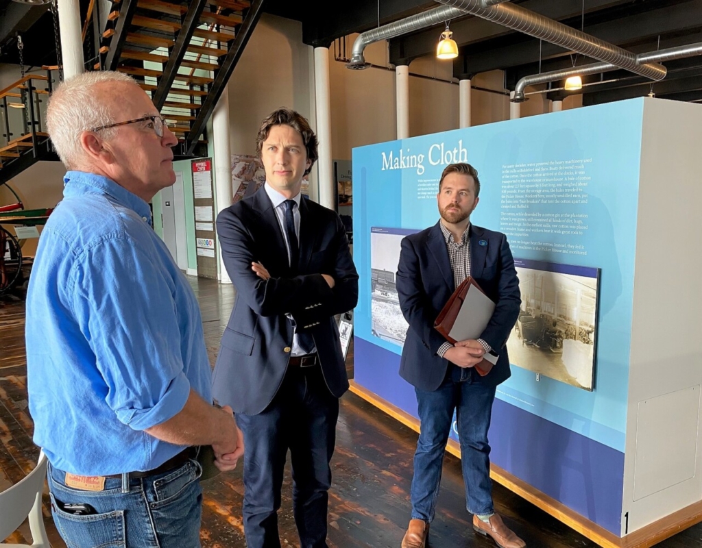 Biddeford mill owner Doug Sanford, left, talks about some of the history of the city’s textile industry with French Consul General Arnaud Mentre, who came to tour Biddeford Tuesday and to converse with Maine House Speaker Ryan Fecteau, right, about topics that included French immersion programs and trade. Tammy Wells Photo