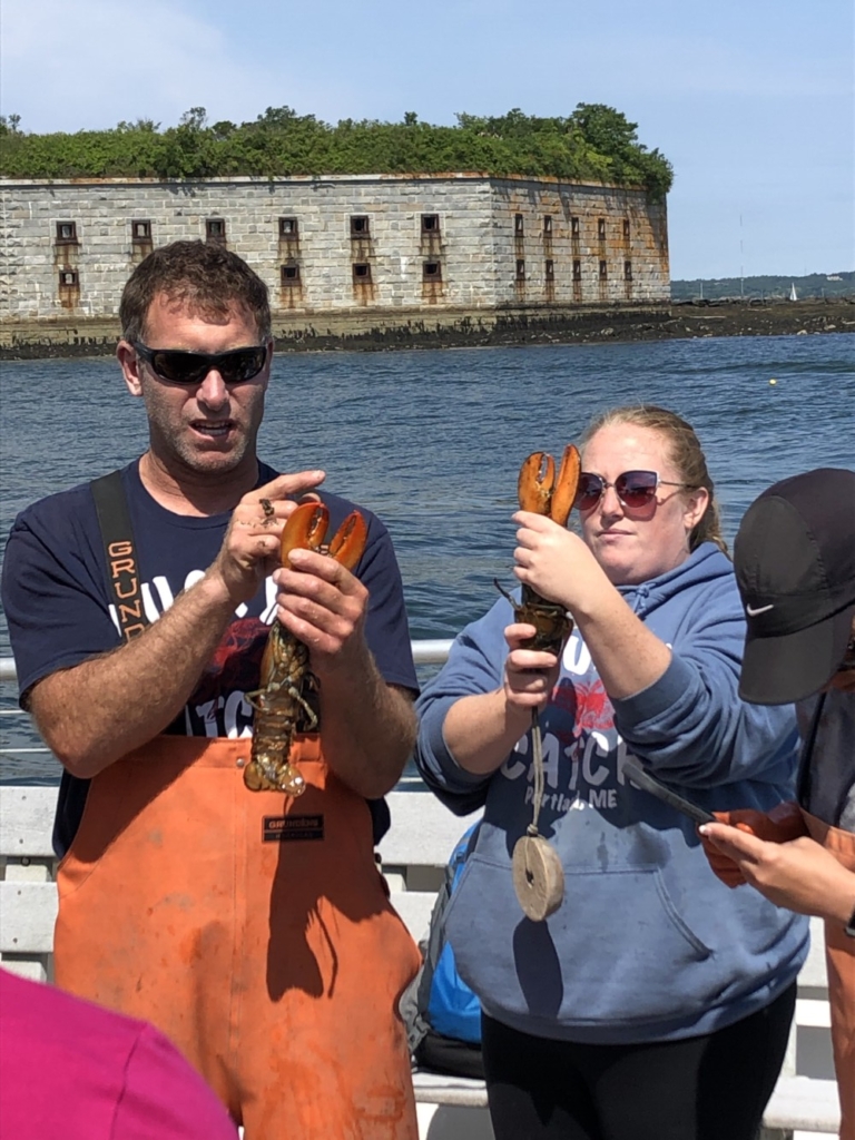 Capt. Tom Martin and Rachel Ashman, crew of Lucky Catch Cruises, showing people what modern-day lobstermen look for when catching lobsters. Martin grew up in Cape Elizabeth and has been lobstering for over 30 years. Catherine Bart photo