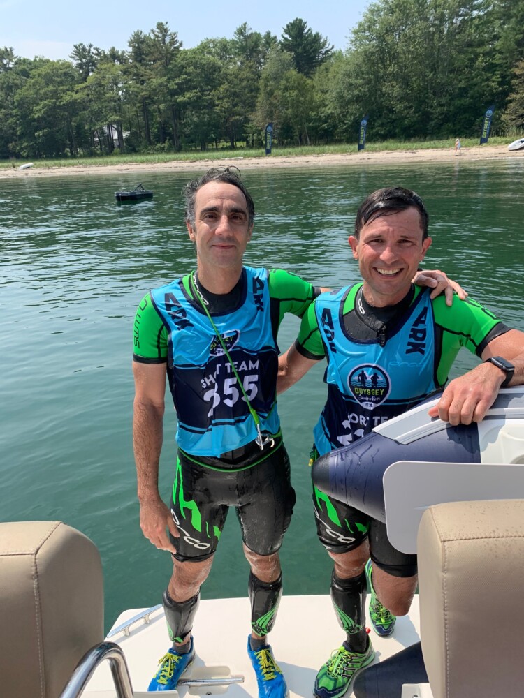 Ivan Puchades of Honeoye Falls, New York, left, and Zeki Gurcan of Scarborough, were the two-person team winners of the Odyssey Swim Run Casco Bay short course last weekend. Starting on Long Island and finishing on Chebeague, they finished the 12-mile course in 2:55:51, 12 minutes ahead of second place finishers Nicole Tackett and Zev Myerowitz of Cape Elizabeth. The course involved 10 running miles and two miles of swimming. Contributed / Patrick Reagan