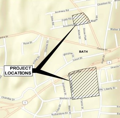 A project area map shows where construction will take place around Western Avenue and Academy Street neighborhoods. Provided by the City of Bath Public Works Department.