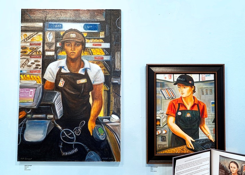 Painter Edith Vonnegut, daughter of author Kurt Vonnegut, has done paintings of various essential workers, the folks who kept clocking in when the world shut down. These include a postal worker and store clerk.