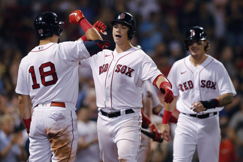 Dalbec’s first homer reached the second row of seats atop the Green Monster in left field and put Boston up 3-0. His second came on a line drive in the seventh that just cleared the yellow line on top of the 37-foot wall and pushed the lead to 12-2.
