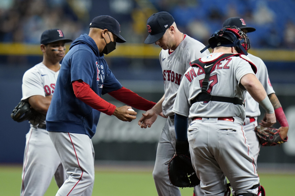 Boston Manager Alex Cora takes the ball from pitcher Brad Peacock as he is taken out in the third inning Tuesday night at St. Petersburg, Fla. Chris O’Meara/Associated Press