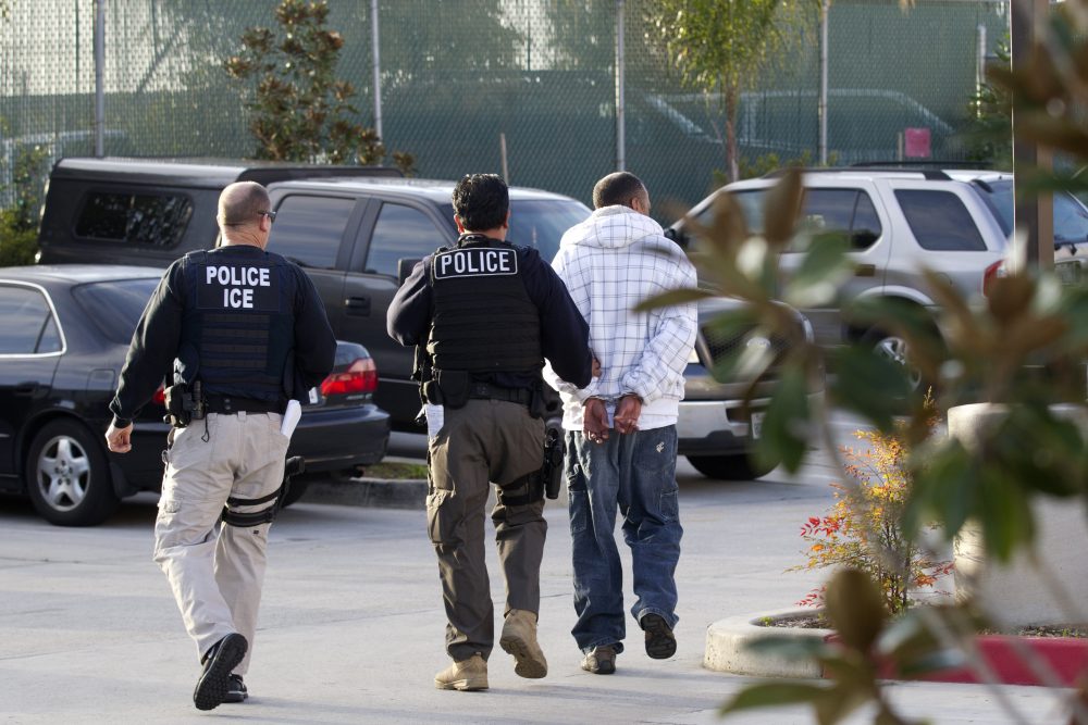 Immigration and Customs Enforcement agents take a suspect into custody as part of a nationwide immigration sweep in Chula Vista, Calif., in 2012. After 9/11, many immigration affairs were transferred to Homeland Security. Gregory Bull/Associated Press