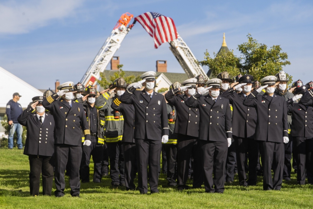 Portland-area first responders stand at attention at Fort Allen Park during a memorial service Saturday. Photo by Carl D. Walsh/Staff Photographer