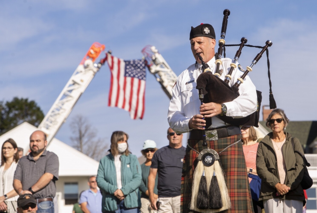 Portland Fire Department Lt. Paul Hallvorsen plays Amazing Grace on the bagpipes Saturday at Fort Allen Park, during a 20 year memorial of the Sept. 11, 2001, terrorist attack on the World Trade Center. Carl D. Walsh/Staff Photographer