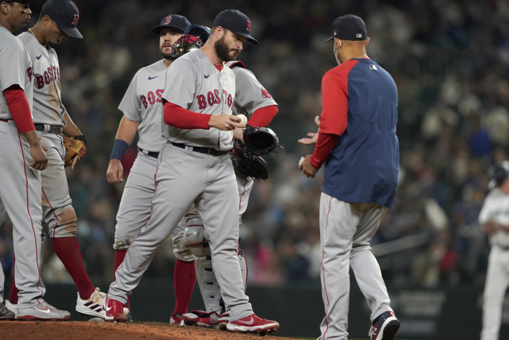 Ryan Brasier, center, is pulled by Manager Alex Cora, right, during the seventh inning after allowing three unearned runs in Boston’s 5-4 loss on Monday in Seattle. Ted S. Warren/Associated Press