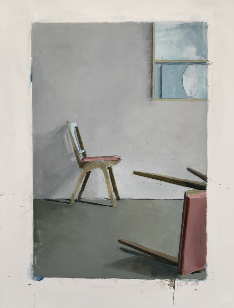 The stillness these paintings emanate is eternal, especially because the objects in them are stripped of practical function, losing their earthly purpose and obliterating their temporality. Sinks stand on their sides, paintings are hung facing the wall and giving us their backs, chairs are stacked on top of each other or toppled over. They are not sad or melancholy; they are just stillness being stillness.
