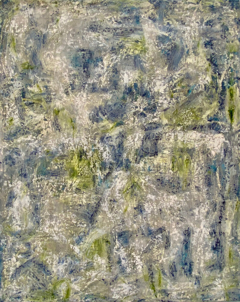 On the opposite wall, Claire Seidl’s abstract paintings pulse with movement and energy. They can be contemplative too, but in a different way. After all, “Art,” as Susan Sontag wrote in her diaries, “is a form of consciousness.” Rather than stillness, these works seemingly channel the rhythms of the natural world. Where Brillhart’s transmit emptiness and depth of space, Seidl’s can mostly be summed up in the title of one work: “In and of Itself.” They are densely layered with color and with textures achieved through the use of brushes, printing brayers, spatulas and palette knives.