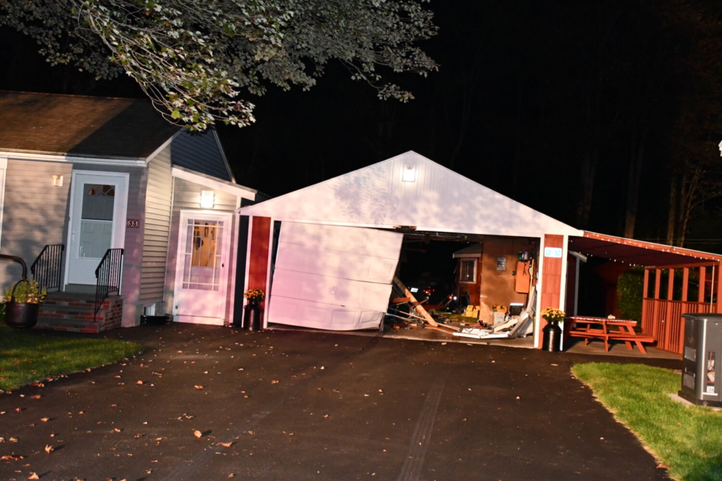 The front view of the garage that 44-year-old Sarah Wiley allegedly crashed through Tuesday evening. Courtesy of Brunswick PD