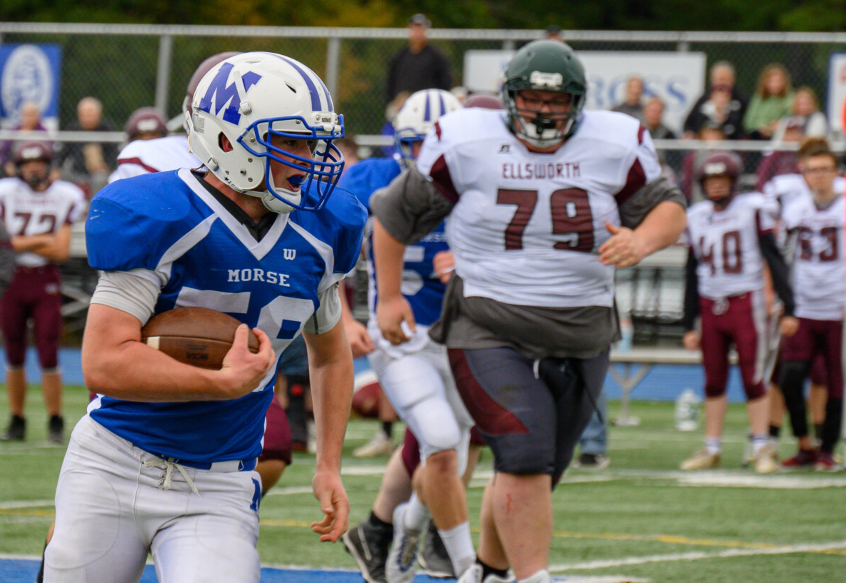 Morse running back Ben Doughty turns the ball up field in a Oct. 2 game against Ellsworth in Bath. Photo provided by Soggy Dog Designs