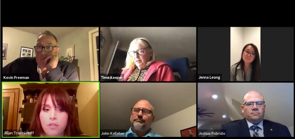 John Kelleher, Jenna Leong, Joshua Pobrislo and Jillian Trapini-Huff answered viewer-submitted questions, fielded by moderator Kevin Freeman and the Scarborough Community Chamber of Commerce, about topics like consolidating Scarborough’s three primary schools and the replacement of the high school turf field and track.