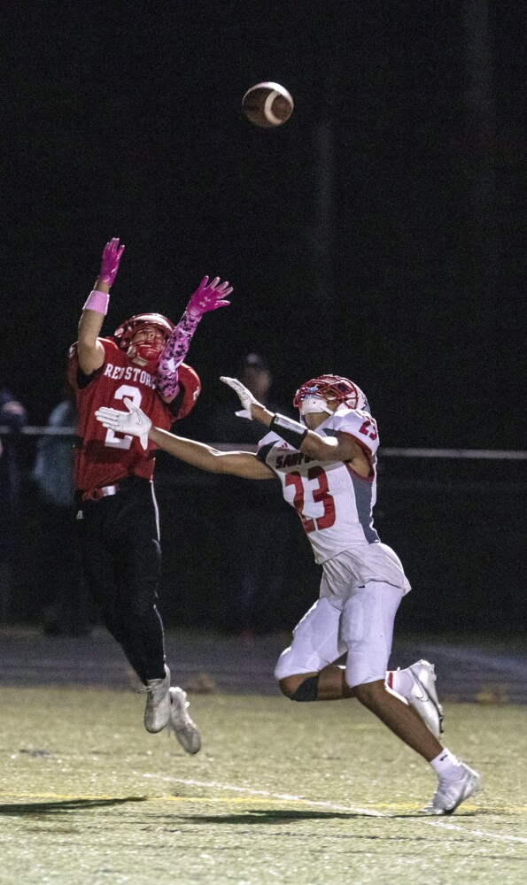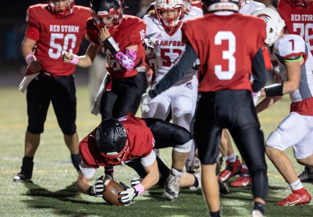 Sanford’s next drive began at its 29 and after McCann found freshman Ryley Watson for one yard and Suhy ran for two, a delay of game penalty backed the Spartans up five yards before McCann threw downfield where senior Ryan Kelly dove and intercepted the ball for the Red Storm at the Sanford 38 on the final play of the quarter.