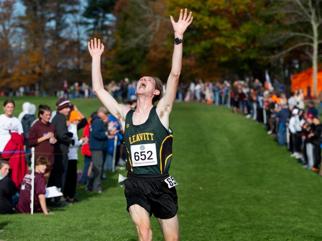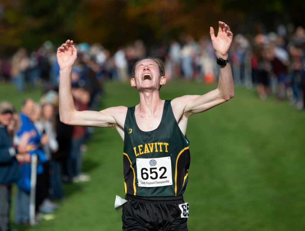 Logan Ouellette of Leavitt raised his arms in triumph and let loose a “Yes!” before crumpling in a heap.