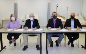 From left, Candy Boyne, John Boyne, Southern Maine Community College President Joe Cassidy and Michael Nozdrovicky, chair of SMCC’s nursing program, sign an agreement by which the Boyne Family will donate $500,000 to the SMCC Foundation to establish an endowed fund dedicated to a nursing faculty position to be named the Boyne Family Endowed Nursing Faculty. Courtesy photo