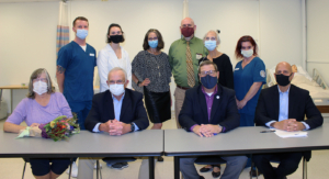 Front row, from left, Candy Boyne, John Boyne, Southern Maine Community College President Joe Cassidy and Michael Nozdrovicky, chair of SMCC’s nursing program. Back row, from left, nursing student Luke White, nursing instructor Breanna Konrad, SMCC Foundation Dean Julie Chase, SMCC Vice President and Academic Dean Paul Charpentier, nursing professor Martha Vrana-Bossert and nursing student Christine LeBlanc. Courtesy photo