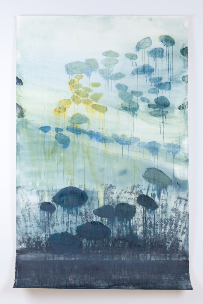 This tension is not immediately apparent. Rather, the works evoke jellyfish, lily pads with tendrils, schools of plankton and other aquatic life. Despite their title, even four enormous “Bluegreen Mountain” paintings initially give this impression. But seen in the larger context of her statement, we begin to realize that they are ultimately more about the crumbling and dissolution of all forms.