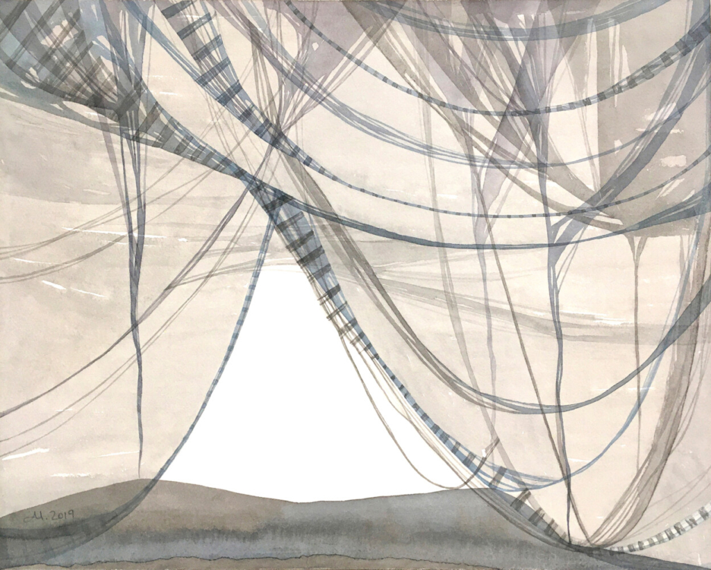 Yet the suspension of time with which much of the poem concerns itself could just as easily apply to all these works, which ultimately refer to the stillness within ourselves that allows us to open to unexpected, often wonderous, things. With consummate skill, Bronstein uses the watercolor medium to “pull” colors across the paper and, in so doing, mimic the act of pulling apart the webs, films and curtains that obscure our truer nature, where all is possibility and potential.